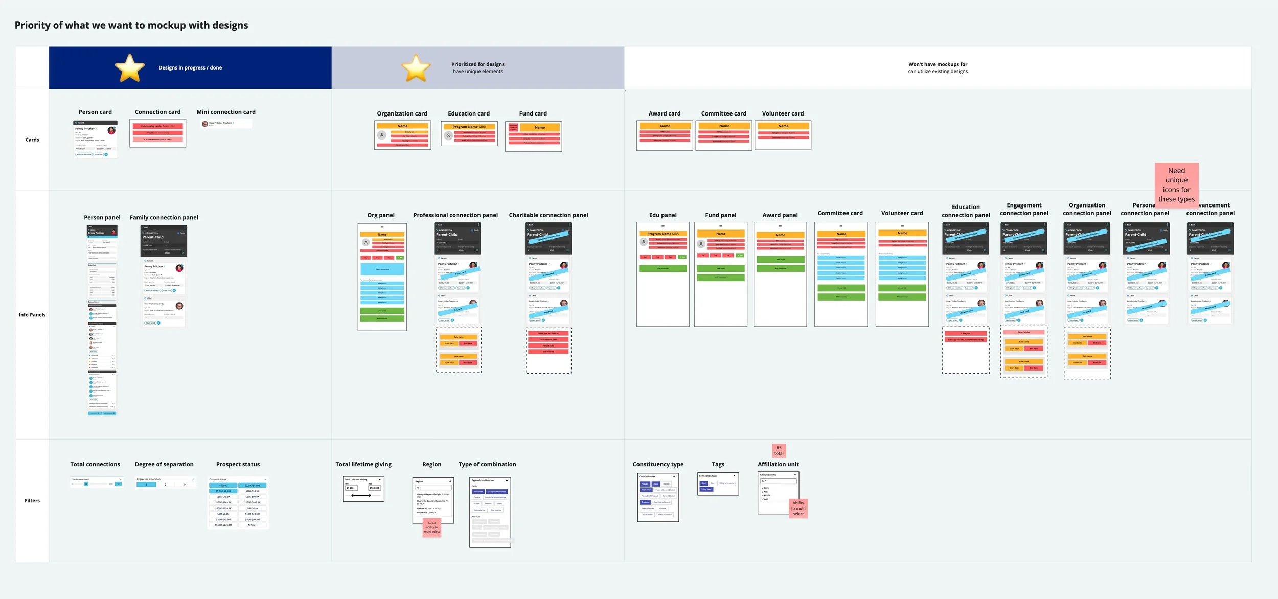 Because of the limited budget, we had to be very strategic with how much we mocked-up and created screen designs for. Without this early understanding of the requirements, we might have designed one generic "Entity card" and one generic "Connection card".